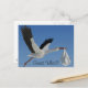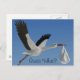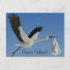Stürme in Flug gegen den blauen Himmel und liefert ein Neugeborenes in weißem Bundle. Perfekt, um die kommende Veranstaltung bekannt zu geben! Einige Kartenversionen haben den Slogan "Ratet was?".