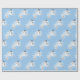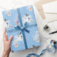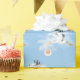 Storch in Wolken fliegen mit einem Baby in einer Decke auf blauem Himmelshintergrund für Babygeschenk. Die Hintergrundfarbe kann geändert werden.