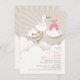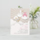 Eine Babydusche-Einladung, die eine Abbildung eines Storchs mit rosa Bundle, Wolken und Sonnenbrand enthält. Personalisieren Sie den Text.