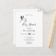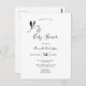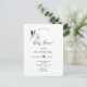 Eine niedliche Einladungskarte für Babyduschen, die einen kleinen Jungen feiert. Ein stilvoller weißer Hintergrund, schwarze Buchstaben. Mit einem fliegenden Storch, der einen kleinen Jungen hält. Personalisieren und fügen Sie den Namen der Mutter-zu-sein und Ihre Party-Details. Zurück: gewöhnliches Postkartendesign.