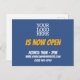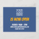 Laden Sie den Namen und die Betriebsstunden Ihres Ladens hoch und senden Sie diese Postkarten an Ihre Mitarbeiter, um ihnen lassen, dass Ihr Geschäft geöffnet ist. Design in klassisch blau, brillant weiß und Safran, alle 2020 Farben des Jahres.