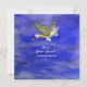 Farbenfroher, lustiger, fliegender Storch mit Baby in einem tiefen 3D blauen Himmel und Wolken.