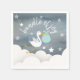 Babyduschservietten mit einer Darstellung eines zwischen den Sternen fliegenden Storchs mit einem blauen Bundle in seinem Schnabel über einem blauen, inspiriert Hintergrund.
