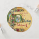 Elegantes antikes mittelalterliches Pergament, lustig Vintages Blumendesign mit einem Baby und fliegendem Storch inmitten der schönen Rosa, Gold, rote Rosen, Frühlingsblumen und grünen Blätter von Bulgan Lumini (c).