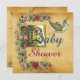 Elegantes antikes mittelalterliches Pergament, lustig Vintages Blumendesign mit einem Baby und fliegendem Storch inmitten der schönen Rosa, Gold, rote Rosen, Frühlingsblumen und grünen Blätter von Bulgan Lumini (c).