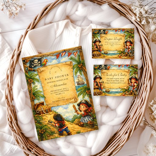 This pirate baby shower design features a whimsical storybook illustration with playful pirate children, tropical palms, treasure chests, and a vintage parchment map at the center. Inspired by classic children’s book art, the warm color palette and detailed scene create a fun, adventurous atmosphere without feeling cartoonish. Ideal for parents who love nautical themes, pirate adventures, and timeless illustrated styles, this design is fully customizable for your celebration details.