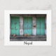 Postkarte von streunenden Hunden, die auf der Straße vor alten, schmutzigen grünen Türen in Kathmandu schlafen, die Hauptstadt Nepal mit weißer Grenze und der Text: 'Nepal' .