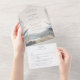 Die Einladung zu einer Hochzeit, ein bezaubernder Umschlag, der sich entfaltet, um Ihre Einladung und Ihre UAWG mit den Speisen zu präsentieren, die beigelegt sind. Die Inneneinrichtung zeigt eine von Hand gezeichnet Abbildung eines Sandstrandes mit üstennahem Blattwerk, das an die ruhige Schönheit des Meeres erinnert. Personalisiert mit den Namen und dem Datum der Braut und des Bräutigams, sowie mit einem eleganten Ankerdesign, ist diese Einladung die perfekte Mischung aus Komfort und KüstennCharme.