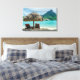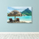 Die Leinwand besteht aus einem Strohsonnenschirm und zwei Liegestühlen auf einem weißen Sandstrand in einem luxuriösen Bungalow-Resort in der blauen Lagune der pazifischen Insel Bora Bora, in der Nähe von Tahiti in Französisch-Polynesien.