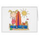 Ein blondes behaartes Strichmännchenmädchen mit einem Surfbrett errichtet ein Sandschloss unter einer lächelnden Sommersonne auf STRAND T - Shirts, Hoodies, Bodysuits, Karten, Aufkleber, Strandtaschen, Magneten und mehr.