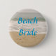Dieser Strand-Brautknopf kennzeichnet die kundengerechten Wörter "Strand-Braut" gegen ein Foto Ozeangezeiten, die in ein sandiges Ufer kommen. Dieses stellt einen perfekten Knopf für Duschen, Junggeselinnen-Abschiede und Proben her. Sehen Sie auch Karten und Porto-Briefmarken Save the Date zusammenbringen.