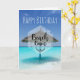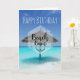 Eine alles Gute zum Geburtstaggrußkarte mit einem tropischen Bild von einem Türkismeer mit einem weißen sandigen Strand und einem Single thatched Strandregenschirm. Typografie sagt Strand-Gammler.
