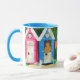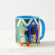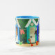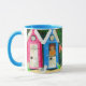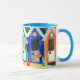 Eine weiße "Wecker" Tasse der guten Qualität mit einer blauen Kante und einem Griff. Der "Strandhütten" Entwurf wird von einer handgemalten Papiercollage gemacht und ist Spülmaschine und Mikrowellensafe. Sehen Sie andere zusammenpassende Produkte, Geschenke und Grußkarten.