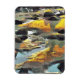 Ein künstlerisches Design der Felsen, Fußabdrücke, Sand- und Felsenpools am Strand bei Sonnenuntergang.