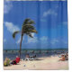 Die farbenfrohe Jahreszeit auf diesem Duschvorhang ist ein Originalfoto von ZoeSPEAK eines Strandes in Key West, Florida. Der Himmel ist tief blau mit puffigen weißen Wolken. Die Sonne scheint auf dem warmen, gelben Sand und ein Steg erstreckt sich entlang des Horizonts des blauen Wassers des Ozeans. Eine einsame Kokospalme liegt am Ufer des Meeres und bietet den Gästen, die am Strand sitzen, einen kleinen Schatten.