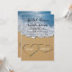 Eine wunderschöne surreale Strandszene mit zwei Herzen gezeichnet im Sand, während Ozean Wellen abstürzen Brautdusche Einladung. Personalisieren Sie Ihre Party-Informationen. Besuchen Sie unseren Laden für weitere Einladungen in der Szene des Strandes.