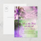 Romantische Vintag Save the Date mit rustikalen alten Palmen, Aquarellfarben, lila Hintergrund und traumhaften Lichtern. Perfekt Save the Date Postkarte für Ziel- und Strandhochzeiten.