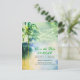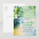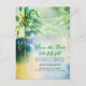 Romantisch Vintag Save the Date mit rustikalen alten Palmen, Aquarellgelb, Gelb und traumhaften Saitenleuchten. Perfekt Save the Date Postkarte für Ziel- und Strandhochzeiten.