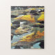 Ein künstlerisches Design der Felsen, Fußabdrücke, Sand- und Felsenpools am Strand bei Sonnenuntergang.