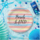 Beach Sand ist in schwarzer Schrift geschrieben. Sommerliche pastellfarbene Aquarellfarben in Korallenrosa, Himmelblau, gelbe Streifen auf weißem Hintergrund. Original Artwork © TamiraZDesign