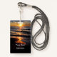 Identifikations-Abzeichen Geschäft des Strandes themed mit den Abzugsleinen geschaffen mit einem schönen Strandsonnenuntergang in einem landschaftlichen Küstenbild der Schönheit entworfen als Geschäfts- oder Ereignis-Abzeichen für einen Ort im Freien, ein christliches Geschäft oder ein Seminar.