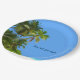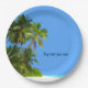 Sommerstrand-Party-Teller mit landschaftlichem Bild der Küstenpalmen und des Strandsandes zusammen mit tropischem Ozean im Hintergrund mit Text, den Sie besonders anfertigen und personifizieren können.  Ein natürlicher Entwurf mit dem Ozean und dem tropischen Laub entworfen als Strandthemapapierplatte, die Sie benutzen können, um Ihre Partygäste zu unterhalten und zu dienen.