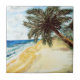 traditionelle Aquarellmalerei einer Strandlandschaft mit Palmen, viel Sand und schönem Meerblick auf einer Keramik