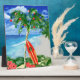 Frohe Feiertage von den warmen sandigen Stränden Ihres tropischen Insellieblingsstrandes. Palme verziert mit Weihnachtsverzierungen und -lichtern, wenn ein Retro Surfbrett am Weihnachtsbaum sich lehnt.
