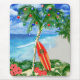 Frohe Feiertage von den warmen sandigen Stränden Ihres tropischen Insellieblingsstrandes. Palme verziert mit Weihnachtsverzierungen und -lichtern, wenn ein Retro Surfbrett am Weihnachtsbaum sich lehnt.
