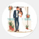 Enthält 20 kleine Aufkleber auf einem Blatt. Delikate Abbildung einer Braut und eines Bräutigams, die einen Kuss unter einem Blumenbogen am Strand teilen, perfekt zum Personalisieren von Geschenken.
