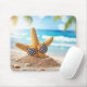Ein Seestern mit einem Polka dot bikini top sitzt teilweise im Sand unter Palmenzweigen begraben, mit einem ruhigen Ozean und einem hellen Himmel im Hintergrund