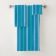 Dieses Set ist mit dünnen, gleichmäßig verteilten Streifen in himmelblau, grün und weiß bedruckt, auf einem hellen, mittelblauen Hintergrund für ein Strandlebnis.