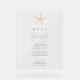 Dieses moderne, spielerische und tropische Hochzeitsmenü umfasst ein Aquarellbild eines Seesterns, das mit schicken Typografien gepaart ist.