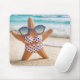 Ein Seestern mit Polka dot bikini und Sonnenbrille steht an einem Sandstrand, der sanft im Hintergrund abstürzt
