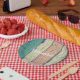Strandhaus aus gestrichenem Holz am Ozean gestreif Pappteller