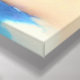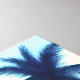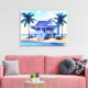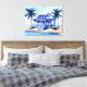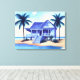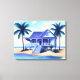 Leinwand in einem bezaubernden Strandhaus mit Veranda, eingebettet zwischen zwei großen Palmen, mit Blick auf einen ruhigen Ozean unter einem hellen, klaren Himmel.