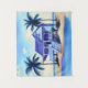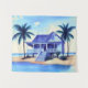 Wandteppiche in einem bezaubernden Strandhaus mit Veranda stehen zwischen zwei großen Palmen, gegenüber einem ruhigen Ozean unter einem hellen, klaren Himmel.