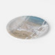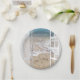 Offenes Fenster mit Vorhängen, die den Namen von Jungvermählten überblicken, in Strandherzen und Sand, wo man Hochzeitsfeiern kann. Namen von Neuvermählten können bearbeitet werden.
