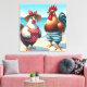 Ein Hahn und eine Henne in Strandbekleidung stehen auf einem Sandstrand mit blauen Ozeanwellen im Hintergrund
