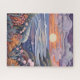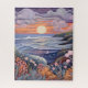 Liebe Rätsel und der See? Das ist das perfekte Rätsel für Sie. Schöne Sonnenuntergangsszene über felsigen Ufern mit Wellen und Wildblumen. Die Farbtöne Orange, Blau, Grün, Rosa und lila machen den Badeort zu einer wahren Augenweide.