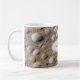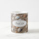Denken Sie an Ihren letzten Sommer am Strand, während Sie eine Tasse Kaffee oder Tee trinken. Verschiedene Muscheln an einem Sandstrand. Der Text ist anpassbar. Sie können Ihren Namen, Ihre Initialen oder einen Text hinzufügen (wie dieses Beispiel).