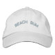 Ein hellblauer bestickter Hut mit dem Text Beach Bum.