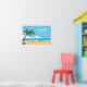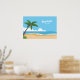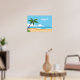 Ein grafisches Poster mit einer Darstellung eines Sandstrandes, eines blauen Himmels, einiger Wolken, einer Palme mit grünen Blätter und einigen Kokospalmen. Diese Wandkunst ist ideal für Zuhause, Bürodekoration oder um sich an Ihren Urlaub zu erinnern. Sie können den Text leer verlassen, wenn Sie es vorziehen!