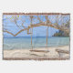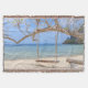 Eine malerische Strandlandschaft mit einem rustikalen Holzschwung, der von einem stabilen Zweig hängt. Der Schwung wird von dicken, verwitterten Seilen aufgehängt, was seinen Charme noch verstärkt. Der Strand ist mit feinem, hellen Sand bedeckt, der sich bis zum klaren, türkisblauen Wasser erstreckt. Im Hintergrund gibt es felsige Klippen, die von üppiger Vegetation bedeckt sind, was die Landschaft noch tiefer und interessanter macht. Der Himmel ist klar, hell und mit einigen Wolken verstreut, was eine friedliche und einladende Atmosphäre schafft. Die Komposition ist ausgewogen, die Schaukel als Mittelpunkt, gerahmt durch die natürlichen Elemente des Strandes und der umliegenden Landschaft. Die sanfte und natürliche Beleuchtung verleiht dem Ganzen eine angenehme Ruhe.