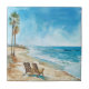 Eine Aquarell-Strandszene mit Stühlen und Palmen