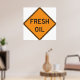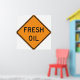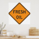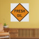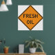 Ein Straßenschild, auf dem frisches Öl auf orangefarbenem Hintergrund steht. Dieses Design sieht wirklich effektiv aus auf diesem Poster