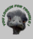 Lustiges Gesichtsbild eines Straußkopfes mit 'SIND SIE NACH DEM PROBLEM SUCHEND ", das um Kopf eingekreist wird
