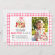 Basket with strawberries, hearts and pink bow Berry First Birthday photo invitation. Announce your little one's "Berry First Birthday" in the most charming way with this delightful photo invitation! This sweet design features an overflowing basket of vibrant red strawberries, accented by whimsical hearts and a delicate pink bow tied to the handle. The playful "Berry First Birthday" text is artfully integrated below, while a cherished photo of your baby takes center stage on the right. All these elements are beautifully framed within a crisp white border, highlighted by a subtle pink line and bordered by classic red gingham, creating a wholesome, picnic-perfect aesthetic. The reverse side continues the charming theme with a full coverage of the coordinating red gingham pattern.