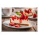 Ein Stück Erdbeere Käsekuchen auf einem Teller.