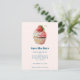 Save the Date Postkarte mit einer leckeren Illustration mit einem köstlich aussehenden Kuchen. Weiße Creme und eine große Erdbeere schmücken diese leckere Leckerei.